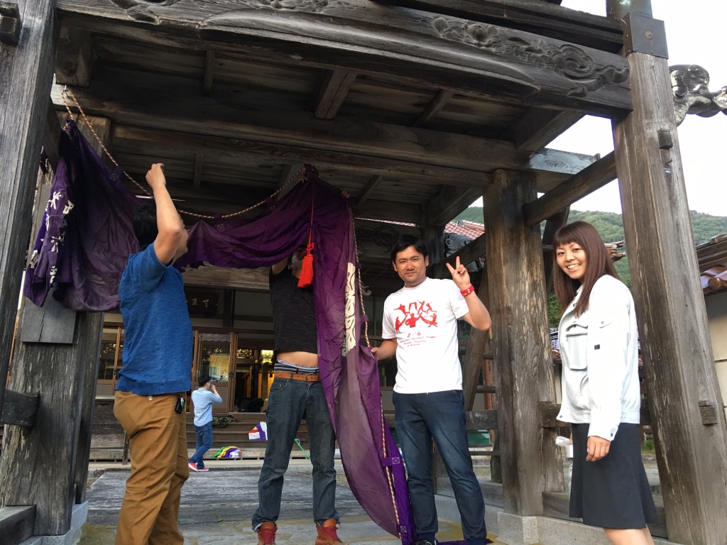 会員の越智さんも交え、あーでもないこーでもないと、幕を張ったり、旗を立てたり。